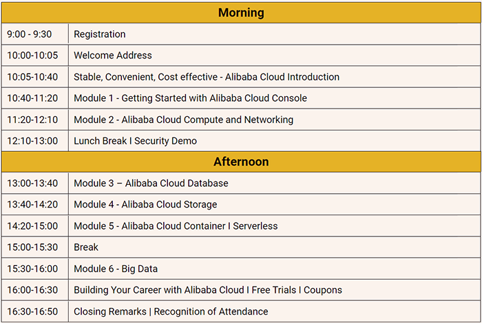 In this full-day, instructor-led, free training event, you will be able to get quick access to the fundamentals of Alibaba Cloud, and get trained by qualified professional experts at Alibaba Cloud. Courses will cover a variety of topics including Elastic Compute, Database, Storage, Network, Container and Big Data services.