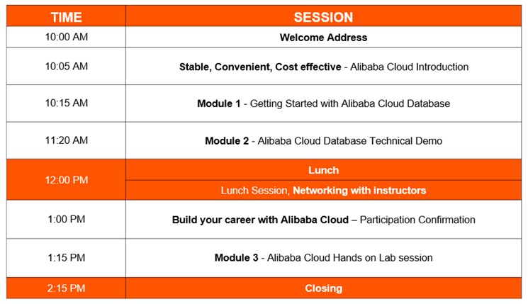 Join us for this half-day hands-on instructor-led workshop and learn how to built databases for all your application needs. | | Workshop Overview Our instructor will provide a quick introduction about Alibaba Cloud's database offerings, a quick walk through about the RDS console and technical hands on demonstration. A number of high level architecture designs will be discussed for database optimization. Also some unique offerings will be introduced with case studies to address extreme scenarios.