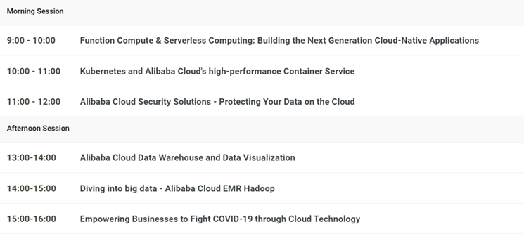 Catch our speakers covering the following topics with you: • Function compute & serverless computing: building the next generation cloud- native applications • Kubernetes and Alibaba Cloud's high- performance container service • Alibaba Cloud Security Solutions- Protecting your data on the cloud • Alibaba Cloud Data warehouse and data visualization • Diving into big data- Alibaba Cloud EMR Hadoop • Quick start guide of Machine Learning and Data Analysis in Alibaba Cloud We look forward to seeing you all online. |